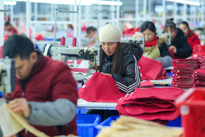 2024年1月18日,社區(qū)居民在紅安社區(qū)的鄉(xiāng)村振興就業(yè)車間工作。紅安社區(qū)是由易地搬遷安置區(qū)單獨成立的新社區(qū),