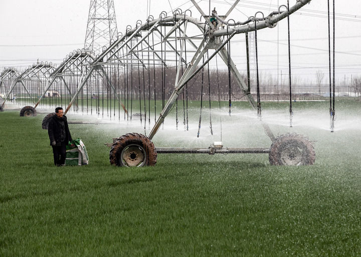 村民使用全自動指針式噴灌機進行澆灌作業(yè)。新華社發(fā)(程全攝)